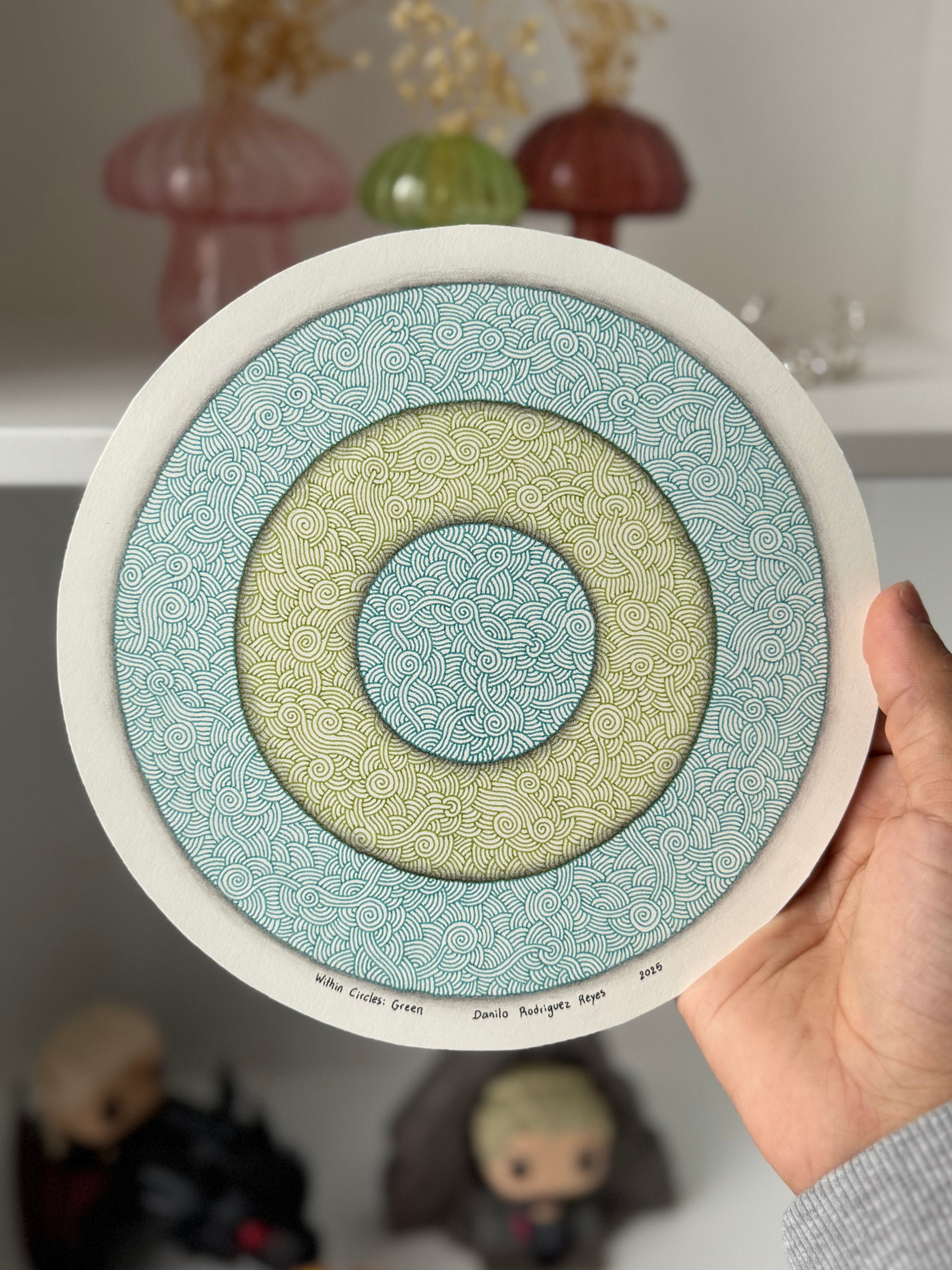 This piece is the original concept work that inspired the Within Circles series. Unlike the rest of the series, which is presented on square paper with a circular drawing, this early work is fully circular in format. It stands alone as a unique and formative piece in the collection.